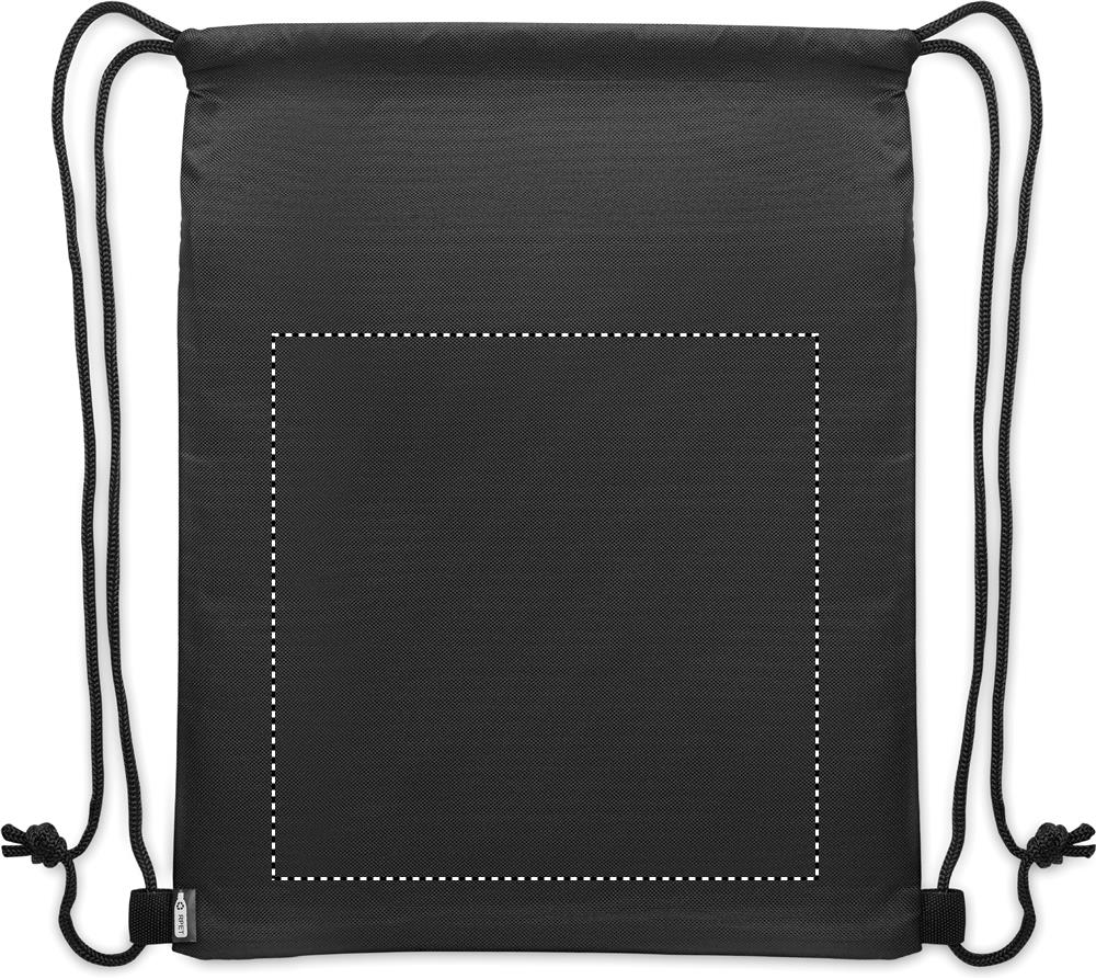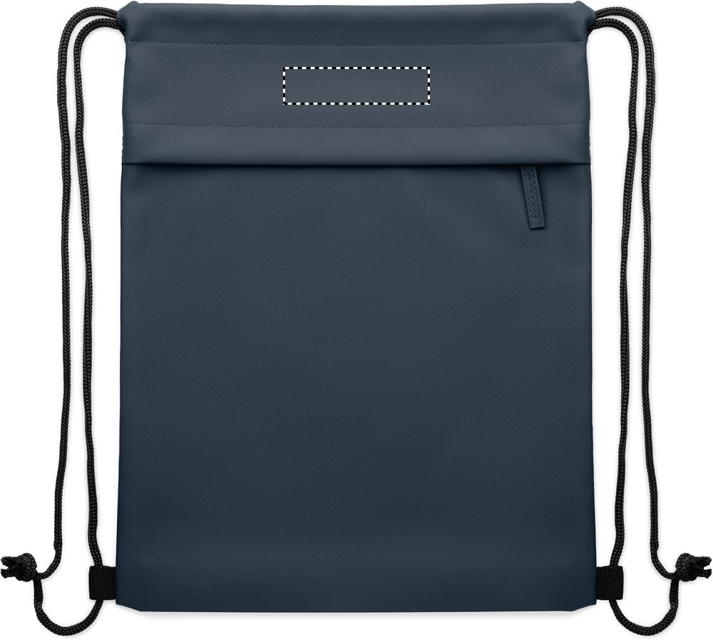 Beutel mit Kordelzug aus PU-beschichtetem 600D RPET-Polyester und 190T RPET-Polyesterfutter. Fronttasche mit Reißverschluss.